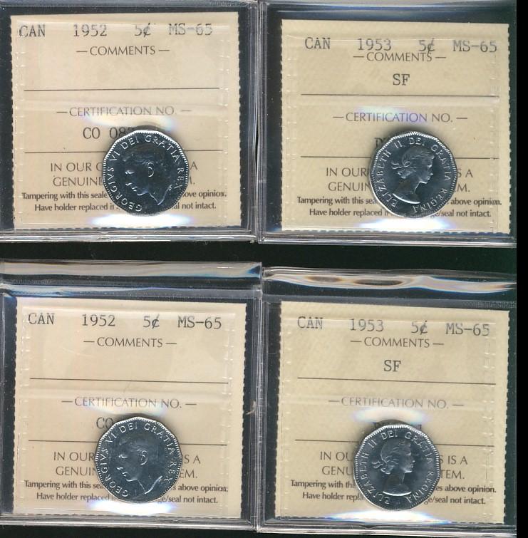 1952 & 1953 SF 5¢ ICCS MS65. Lot of 4 coins, 2 of each date.