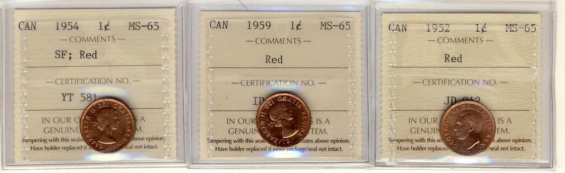 1952, 1954 SF & 1959 1¢ ICCS MS65. Lot of 3 coins ALL full red.
