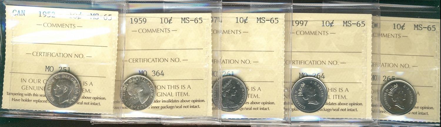 1952, 1959, 1974, 1997 & 2000 10¢ ICCS MS65. Lot of 5 coins.