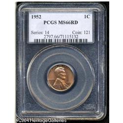 1952 1C MS66 Red PCGS. Well struck and fully lustr <B>1952 1C MS66 Red PCGS.</B></I> Well struck and fully lustrous, with variegated pink, red-orange, and steel-gray colors, and a few small, scattered contact marks. <BR><BR><B>Important notice:</B> Heritage usually auctions material at the rate of 200-250 lots per hour. On some occasions eBay Live bid software or the Internet may not be able to keep up with the pace of the auction. We recommend placing a realistic absentee bid now as insurance to avoid disappointment. Occasionally the auctioneer may eliminate or reject an eBay Live bid, and the auctioneer may also reopen a lot after the close of the eBay live bidding (usually because we missed an audience bid), and may reject your bid even if it shows you as the winning bidder. By bidding via eBay Live, you agree that Heritage may award the lot to another bidder at its sole discretion under the circumstances described above or any other reasonable circumstances. Since eBay bids are not shown to us until we open the lot on the floor, we treat those bids just like floor bids. In most cases the floor responds before the eBay bid is presented to us, due to Internet lag time, so for consistency we have made it a policy that floor bids are always considered first over tie eBay live bids. Also please note that all Heritage lots purchased through eBay Live carry a 20% Buyer's Premium. Please make sure you read the Terms and Conditions before you bid. This lot is being auctioned in conjunction with a live floor auction by Heritage Galleries & Auctioneers. All final auction and invoice information will be supplied by Heritage Galleries & Auctioneers, and all other information should be considered preliminary. Lot:5378