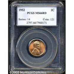 1952 1C MS66 Red PCGS. Highly lustrous with fiery, original color and only a few trivial flecks of carbon.From the Mike Sadler Collection. Important notice: Heritage usually auctions material at the rate of 200-250 lots per hour. On some occasions eBay Live bid software or the Internet may not be able to keep up with the pace of the auction. We recommend placing a realistic absentee bid now as insurance to avoid disappointment. Occasionally the auctioneer may eliminate or reject an eBay Live bid, and the auctioneer may also reopen a lot after the close of the eBay live bidding (usually because we missed an audience bid), and may reject your bid even if it shows you as the winning bidder. By bidding via eBay Live, you agree that Heritage may award the lot to another bidder at its sole discretion under the circumstances described above or any other reasonable circumstances. Also please note that all Heritage lots purchased through eBay Live carry a 20% Buyer's Premium. Please make sure you read the Terms and Conditions before you bid.