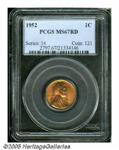 1952 1C MS67 Red PCGS. Bright, even color, the su