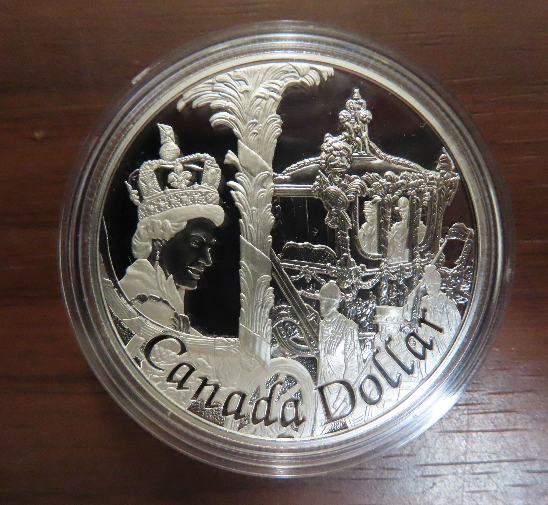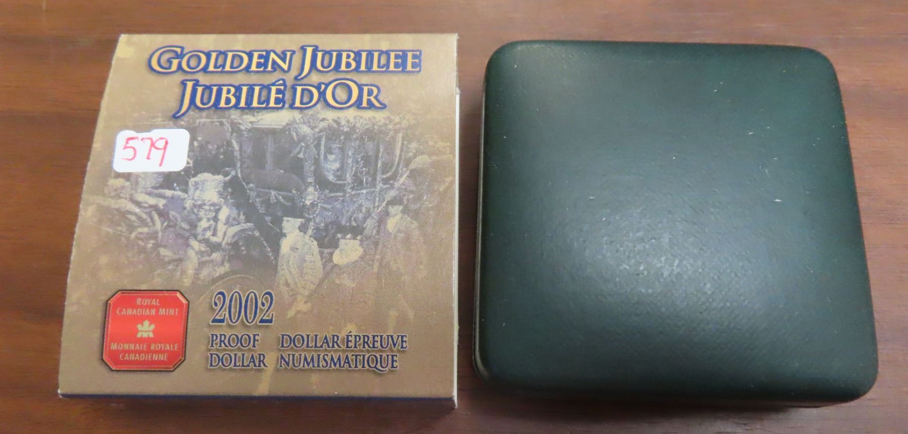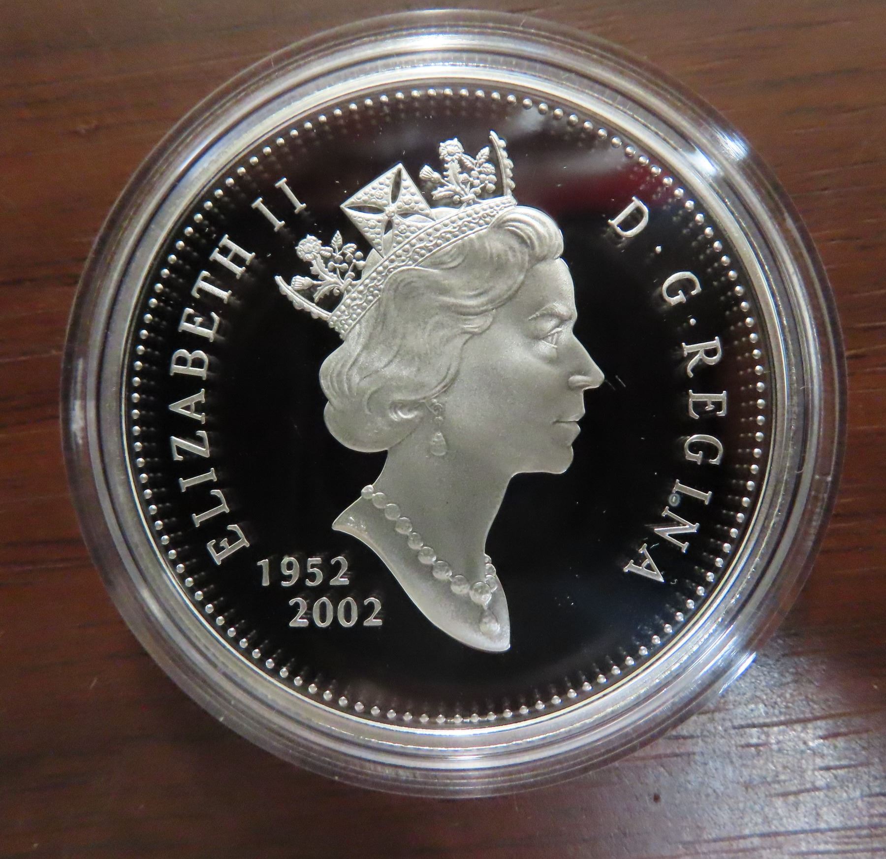 1952 – 2002 Proof Silver Dollar. Commemorates the Golden Jubilee (25th Anniversary) of Queen Elizabeth. Housed in its original Royal Canadian Mint case of issue. Bright White.
