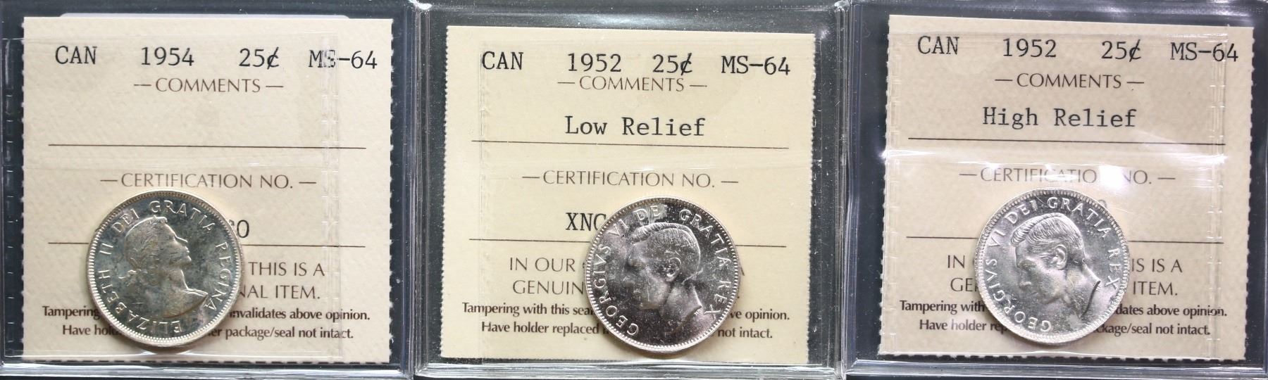 1952 25¢ HR, 1952 LR, and 1954 all ICCS Choice Mint State-64, lot of 3 coins.