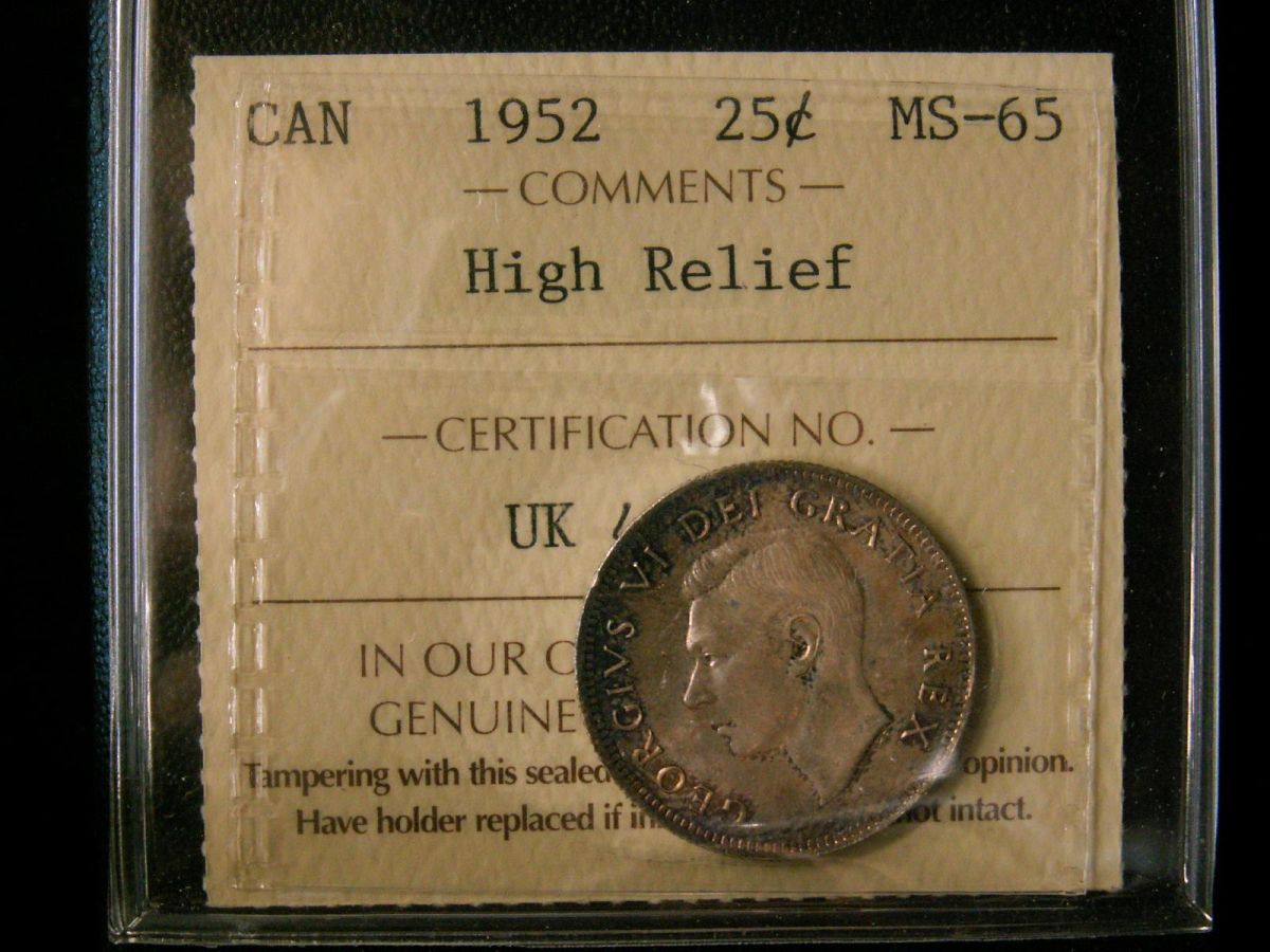 1952 25¢ High Relief ICCS MS65. Another PQ example with gem toning.