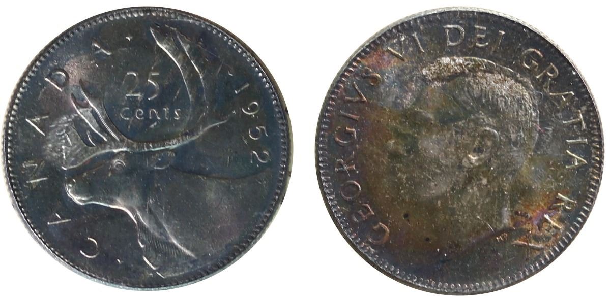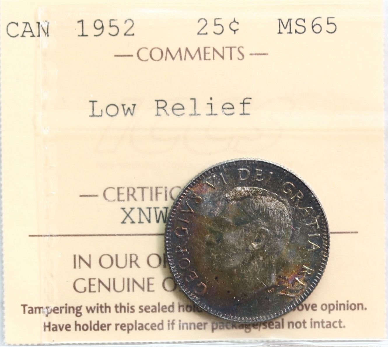1952 25¢ "Low Relief" ICCS Gem Mint State-65, Intense autumn shades over full underlying lustre.