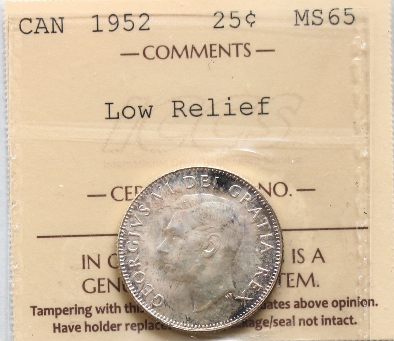 1952 25¢ "Low relief" ICCS Gem Mint State-65 Brilliant with delicate russet tone.