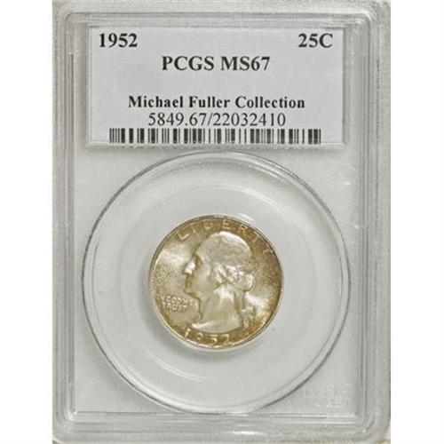 <B>1952 25C MS67 PCGS.</B></I> Michael Fuller Collection. PCGS Population (54/0). NGC Census: (144/4). Mintage: 38,862,072. Numismedia Wsl. Price for NGC/PCGS coin in MS67: $210. (#5849)<BR><BR><B>Coin Engraver:</B> John Flanagan<BR><BR><b>Shipping:</b> Coins & Currency (<a target="_blank" href="http://www.heritageauctions.com/common/shipping.php">view shipping information</a>)