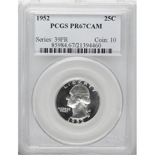 <B>1952 25C PR67 Cameo PCGS.</B></I> Superbird. FS-25-1952-901. This beautifully cameoed Superb Gem is smooth from rim to rim with dazzling, all-brilliant surfaces. An S-shaped mark on the breast of the eagle of unknown origin gives this variety the nickname "Superbird."<BR><BR><b>Shipping:</b> Coins & Currency (<a target="_blank" href="http://www.heritageauctions.com/common/shipping.php">view shipping information</a>)