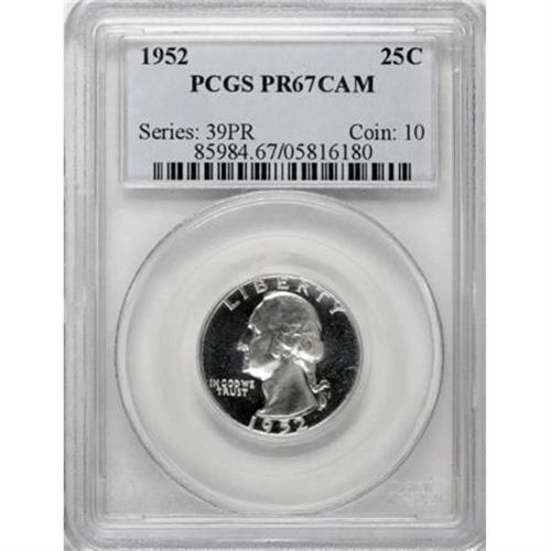 <B>1952 25C PR67 Cameo PCGS.</B></I> An essentially black-and-white piece, though the degree of frost on the exactingly struck devices is not so strong as to warrant a Deep Cameo designation. Carefully preserved and attractive. PCGS has graded only five finer Cameo examples (1/08).<BR><BR><b>Shipping:</b> Coins & Currency (<a target="_blank" href="http://www.heritageauctions.com/common/shipping.php">view shipping information</a>)