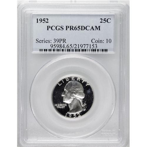 <B>1952 25C Superbird PR65 Deep Cameo PCGS.</B></I> Although undesignated on the PCGS holder, this is the popular "Superbird" variety, named for the partial S on the eagle's chest, apparently engraved by hand on the working reverse die. Perhaps more significantly, the devices are thickly frosted, and the fields are deeply mirrored. A splendid Gem. Population: 2 in 65 Deep Cameo, 8 finer (12/06).<BR><BR><b>Shipping:</b> Coin/Currency (<a target="_blank" href="http://www.heritageauctions.com/common/shipping.php">view shipping information</a>)