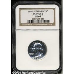 <B>1952<25C> Superbird PR66 NGC.</B></I> FS-1952-3. An S mintmark is possibly misplaced on the very center of the eagle's breast. Although the curves of the apparent mintmark are in low relief, only the tail is not visible. The reverse of this brilliant and seemingly immaculate premium Gem has mild white on black contrast. Population: 12 in 66, 7 finer (5/04). <BR><BR><B>Important notice:</B> Heritage usually auctions material at the rate of 200-250 lots per hour. On some occasions eBay Live bid software or the Internet may not be able to keep up with the pace of the auction. We recommend placing a realistic absentee bid now as insurance to avoid disappointment. Occasionally the auctioneer may eliminate or reject an eBay Live bid, and the auctioneer may also reopen a lot after the close of the eBay live bidding (usually because we missed an audience bid), and may reject your bid even if it shows you as the winning bidder. By bidding via eBay Live, you agree that Heritage may award the lot to another bidder at its sole discretion under the circumstances described above or any other reasonable circumstances. Since eBay bids are not shown to us until we open the lot on the floor, we treat those bids just like floor bids. In most cases the floor responds before the eBay bid is presented to us, due to Internet lag time, so for consistency we have made it a policy that floor bids are always considered first over tie eBay live bids. Also please note that all Heritage lots purchased through eBay Live carry a 20% Buyer's Premium. Please make sure you read the Terms and Conditions before you bid. </span></font></tr></table></td></tr></table>