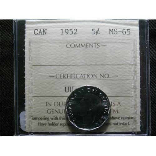 1952 5¢ ICCS MS65. Fully struck with full luster. A true "Gem"