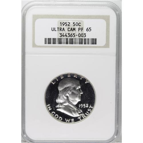 <B>1952 50C PR65 Ultra Cameo NGC.</B></I> Thanks to the efforts of Tomaska and other pioneers, the scarcity of Cameo, Ultra Cameo, and Deep Cameo coins from the early 1950s is well-documented. The devices on each side are richly frosted, and the fields sport immense reflectivity and only the slightest haze. An excellent opportunity for the discerning series enthusiast. Census: 8 in 65 Ultra Cameo, 3 finer (12/06).<BR><BR><b>Shipping:</b> Coin/Currency (<a target="_blank" href="http://www.heritageauctions.com/common/shipping.php">view shipping information</a>)