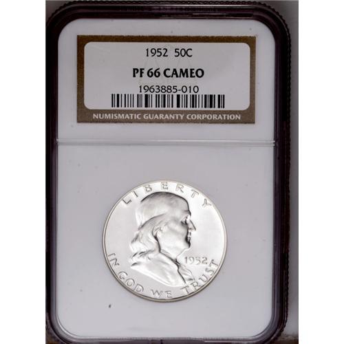 <B>1952<50C> PR66 Cameo NGC.</B></I> The inky-black fields are deeply reflective and the silver devices are noticeably frosted. Both sides are contact-free and void of hairlines. A scarce early proof issue in the Franklin half dollar series. <BR><BR><B>Important notice:</B> Heritage usually auctions material at the rate of 200-250 lots per hour. On some occasions eBay Live bid software or the Internet may not be able to keep up with the pace of the auction. We recommend placing a realistic absentee bid now as insurance to avoid disappointment. Occasionally the auctioneer may eliminate or reject an eBay Live bid, and the auctioneer may also reopen a lot after the close of the eBay live bidding (usually because we missed an audience bid), and may reject your bid even if it shows you as the winning bidder. By bidding via eBay Live, you agree that Heritage may award the lot to another bidder at its sole discretion under the circumstances described above or any other reasonable circumstances. Since eBay bids are not shown to us until we open the lot on the floor, we treat those bids just like floor bids. In most cases the floor responds before the eBay bid is presented to us, due to Internet lag time, so for consistency we have made it a policy that floor bids are always considered first over tie eBay live bids. Also please note that all Heritage lots purchased through eBay Live carry a 20% Buyer's Premium. Please make sure you read the Terms and Conditions before you bid. This lot is being auctioned in conjunction with a live floor auction by Heritage Galleries & Auctioneers. All final auction and invoice information will be supplied by Heritage Galleries & Auctioneers, and all other information should be considered preliminary. Lot:3148 <BR><BR><B>Winning Notification and Billing:</B> After the FINAL session in this auction is complete, Heritage will send e-mail and snail mail invoices. This process normally takes several days. All final auction and invoice information will be supplied by Heritage Galleries & Auctioneers, and all other information should be considered preliminary. <BR><BR>This auction will be conducted on a live auction floor and over the Internet through eBay Live. If you choose to place an absentee bid, please take a moment to <font color='#0000ff'><u><a href='http://pages.ebay.com/liveauctions/help/before/laabsentee.html'>learn how eBay Live absentee bidding works</a></u></font><font color='#000000'>