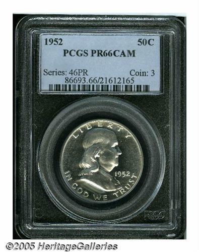 <B>1952<50C> PR66 Cameo PCGS.</B></I> A lovely cameo proof that has frosty devices and dark mirrored fields. Well struck and seemingly unimprovable.