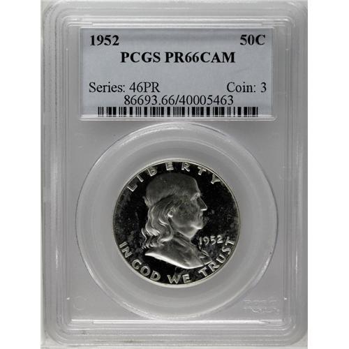 <B>1952<50C> PR66 Cameo PCGS.</B></I> Traces of brown toning appear on the deeply mirrored, dramatically reflective fields and frosted devices. Thin die striations appear in some prime focal areas. Population: 68 in 66, 20 finer (6/06).