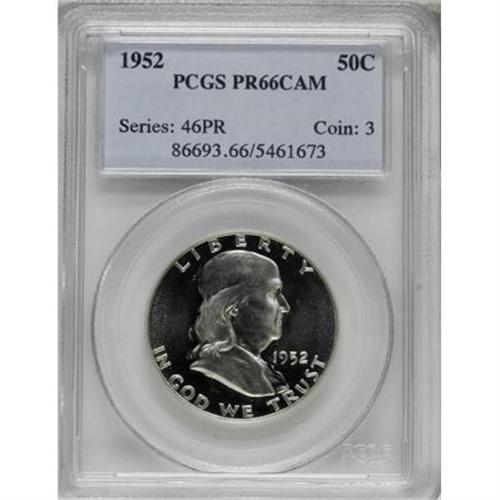 <B>1952 50C PR66 Cameo PCGS.</B></I> An awesome strike is the hallmark of this conditionally scarce Premium Gem, as even the upper lettering of the Liberty Bell is razor-sharp. Essentially untoned, with dynamic reflectivity noted in the fields, and lovely frost on the silver-white devices. <BR><BR><b>Shipping:</b> Coins & Currency (<a target="_blank" href="http://www.heritageauctions.com/common/shipping.php">view shipping information</a>)