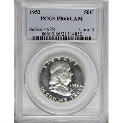 <B>1952 50C PR66 Cameo PCGS.</B></I> The essentially toned fields and delicately frosted devices combine for moderate contrast on this attractive Premium Gem. Excellent definition and delightful preservation. PCGS has graded 26 finer Cameo coins (1/08).<BR><BR><b>Shipping:</b> Coins & Currency (<a target="_blank" href="http://www.heritageauctions.com/common/shipping.php">view shipping information</a>)
