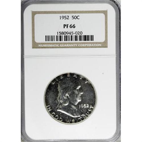 <B>1952 50C PR66 NGC.</B></I> NGC Census: (528/247). PCGS Population (487/94). Mintage: 81,980. Numismedia Wsl. Price for NGC/PCGS coin in PR66: $280. (#6693)<BR><BR><B>Coin Engraver:</B> John R. Sinnock<BR><BR><b>Shipping:</b> Coins & Currency (<a target="_blank" href="http://www.heritageauctions.com/common/shipping.php">view shipping information</a>\)