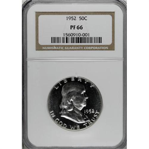 <B>1952 50C PR66 NGC.</B></I> NGC Census: (534/246). PCGS Population (487/95). Mintage: 81,980. Numismedia Wsl. Price for NGC/PCGS coin in PR66: $280. (#6693)<BR><BR><B>Coin Engraver:</B> John R. Sinnock<BR><BR><b>Shipping:</b> Coins & Currency (<a target="_blank" href="http://www.heritageauctions.com/common/shipping.php">view shipping information</a>)