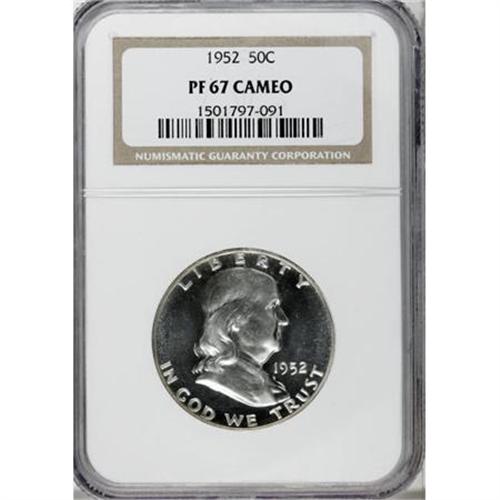 <B>1952 50C PR67 Cameo NGC.</B></I> Deeply reflective with faint haze over the obverse fields and parts of the reverse. This boldly struck example, which sports suitably frosted devices, is one of the finer Cameo proof specimens certified by NGC. Census: 73 in 67 Cameo, 1 finer (1/08). <BR><BR><b>Shipping:</b> Coins & Currency (<a target="_blank" href="http://www.heritageauctions.com/common/shipping.php">view shipping information</a>)