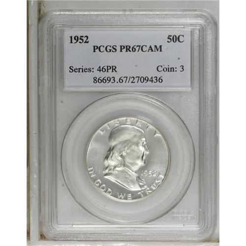 <B>1952 50C PR67 Cameo PCGS.</B></I> Fully impressed with deeply mirrored, dramatically reflective fields, and pristine, snow-white devices. Numerous slender die striations (as struck) reside on the central devices. This piece is a borderline Deep Cameo example that may deserve another look by the grading service. Population: 22 in 67 Cameo, 1 finer (3/07).<BR><BR><b>Shipping:</b> Coins & Currency (<a target="_blank" href="http://www.heritageauctions.com/common/shipping.php">view shipping information</a>)