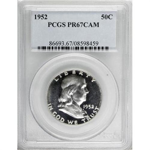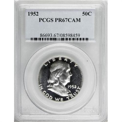 <B>1952 50C PR67 Cameo PCGS.</B></I> Fully struck with jet-black fields, nicely frosted devices, and intense cameo contrast on both sides. Distraction-free with faint die lines on the central devices. A scarce early proof issue in the Franklin half dollar series. Population: 22 in 67 Cameo, 1 finer (4/07).<BR><BR><b>Shipping:</b> Coins & Currency (<a target="_blank" href="http://www.heritageauctions.com/common/shipping.php">view shipping information</a>)