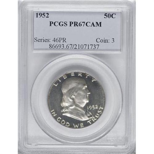 <B>1952 50C PR67 Cameo PCGS. CAC.</B></I> Dusky yellow-gold toning drapes this satiny and undisturbed Superb Gem proof. The hair curls near the ear show essentially complete definition. The lower mintage 1952 is elusive in exemplary condition with noticeable cameo contrast on the portrait and bell. Population: 25 in 67 Cameo, 1 finer (11/07).<BR><I>From The Kallenberg #1 PCGS Registry Set Of Proof Half Dollars.</B></I><BR><BR><b>Shipping:</b> Coins & Currency (<a target="_blank" href="http://www.heritageauctions.com/common/shipping.php">view shipping information</a>)