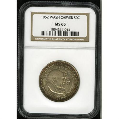 <B>1952 50C Washington-Carver MS65 NGC.</B></I> NGC Census: (1070/207). PCGS Population (879/160). Mintage: 2,006,292. Numismedia Wsl. Price for NGC/PCGS coin in MS65: $70. (#9434)<BR><I>From The Frank DuVall Collection of U.S. Commemoratives.</B></I><BR><BR><b>Shipping:</b> Coins & Currency (<a target="_blank" href="http://www.heritageauctions.com/common/shipping.php">view shipping information</a>)