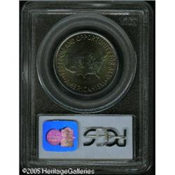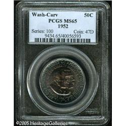 <B>1952 50C Washington-Carver MS65 PCGS.</B></I> Both sides are draped in a rich blend of colors, with eye appeal at a real premium for the grade. Deep purple-rose and emerald-green toning shows on the obverse, while bright lime-green, cobalt-blue, lemon-gold, and purple-red patina decorates the reverse. Well struck with a few trivial abrasions. Lot:8622