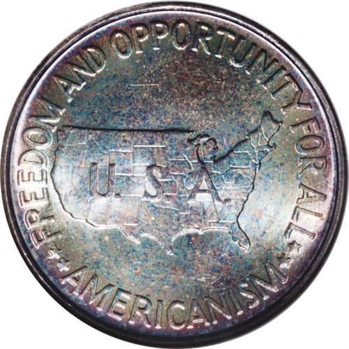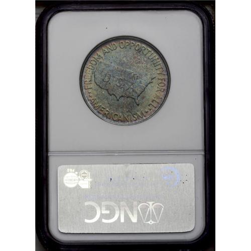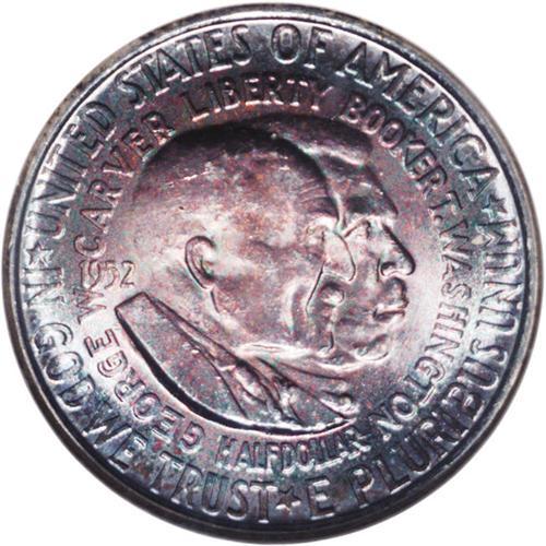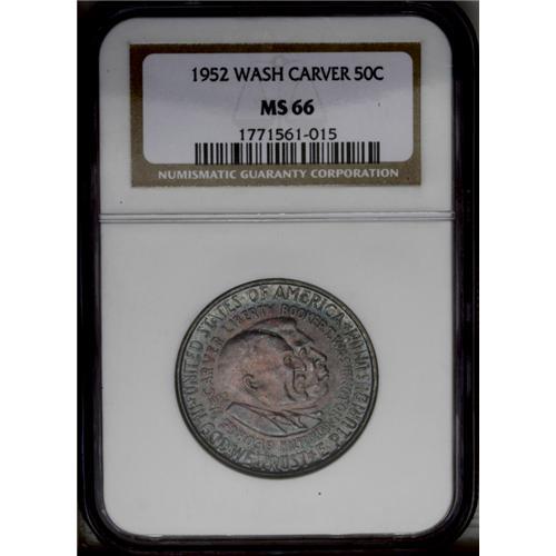 <B>1952<50C> Washington-Carver MS66 NGC.</B></I> A gorgeous display of iridescent medium intensity cobalt-blue and lavender toning blankets the obverse, while the reverse takes on a slighter lower intensity of a similar color scheme. The design elements are sharply delineated, and the highly lustrous surfaces reveal just a couple of minute marks on the cheeks of the obverse portraits. Only eight pieces have been certified finer by NGC (3/06). <BR><BR><B>Important notice:</B> Heritage usually auctions material at the rate of 200-250 lots per hour. On some occasions eBay Live bid software or the Internet may not be able to keep up with the pace of the auction. We recommend placing a realistic absentee bid now as insurance to avoid disappointment. Occasionally the auctioneer may eliminate or reject an eBay Live bid, and the auctioneer may also reopen a lot after the close of the eBay live bidding (usually because we missed an audience bid), and may reject your bid even if it shows you as the winning bidder. By bidding via eBay Live, you agree that Heritage may award the lot to another bidder at its sole discretion under the circumstances described above or any other reasonable circumstances. Since eBay bids are not shown to us until we open the lot on the floor, we treat those bids just like floor bids. In most cases the floor responds before the eBay bid is presented to us, due to Internet lag time, so for consistency we have made it a policy that floor bids are always considered first over tie eBay live bids. Also please note that all Heritage lots purchased through eBay Live carry a 20% Buyer's Premium. Please make sure you read the Terms and Conditions before you bid. This lot is being auctioned in conjunction with a live floor auction by Heritage Galleries & Auctioneers. All final auction and invoice information will be supplied by Heritage Galleries & Auctioneers, and all other information should be considered preliminary. Lot:5137 <BR><BR><B>Winning Notification and Billing:</B> After the FINAL session in this auction is complete, Heritage will send e-mail and snail mail invoices. This process normally takes several days. All final auction and invoice information will be supplied by Heritage Galleries & Auctioneers, and all other information should be considered preliminary. <BR><BR>This auction will be conducted on a live auction floor and over the Internet through eBay Live. If you choose to place an absentee bid, please take a moment to <font color='#0000ff'><u><a href='http://pages.ebay.com/liveauctions/help/before/laabsentee.html'>learn how eBay Live absentee bidding works</a></u></font><font color='#000000'>