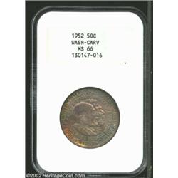 1952 50C Washington-Carver MS66 NGC. Vibrant orange and blue toning rests gently on the surfaces of this specimen. Only a handful of finer specimens have been graded higher by NGC and PCGS. Important notice: We expect to be auctioning lots at the rate of 200-250 per hour. Sometimes eBay Premier live bid software cannot keep up with that pace, so we strongly recommend that you place a realistic proxy bid now as insurance to avoid disappointment. Also please note that all Heritage/CAA lots purchased through eBay Premier carry a 20% Buyer's Premium. Please make sure you read the Terms and Conditions.