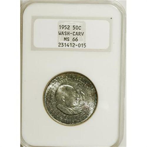 <B>1952 50C Washington-Carver MS66 NGC.</B></I> NGC Census: (193/11). PCGS Population (148/4). Mintage: 2,006,292. Numismedia Wsl. Price for NGC/PCGS coin in MS66: $480. (#9434)<BR><BR><b>Shipping:</b> Coins & Currency (<a target="_blank" href="http://www.heritageauctions.com/common/shipping.php">view shipping information</a>)