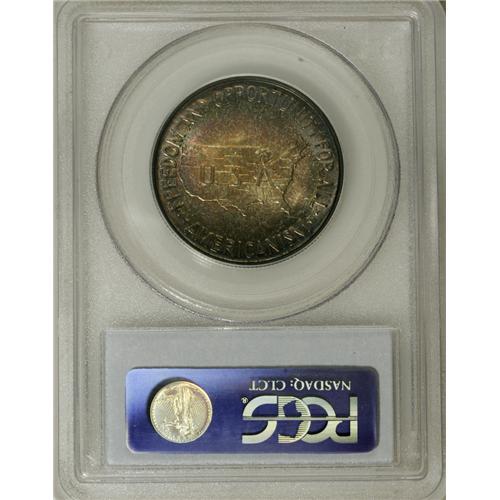 <B>1952 50C Washington-Carver MS66 PCGS.</B></I> Highly lustrous beneath rich, colorful patina. Each side has emerald-tinged plum patina at the rims and an orange-toned center. PCGS has graded only four coins finer (1/07).<BR><BR><b>Shipping:</b> Coins & Currency (<a target="_blank" href="http://www.heritageauctions.com/common/shipping.php">view shipping information</a>)