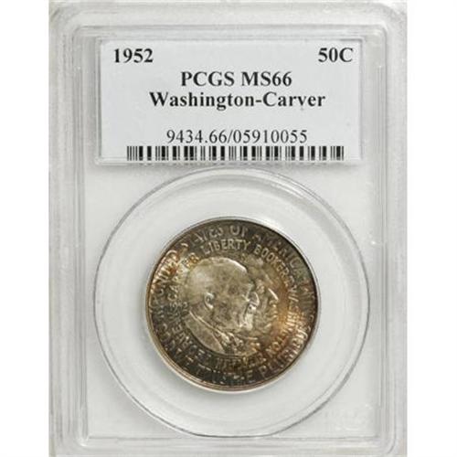 <B>1952 50C Washington-Carver MS66 PCGS.</B></I> PCGS Population (162/4). NGC Census: (201/12). Mintage: 2,006,292. Numismedia Wsl. Price for NGC/PCGS coin in MS66: $480. (#9434)<BR><BR><b>Shipping:</b> Coins & Currency (<a target="_blank" href="http://www.heritageauctions.com/common/shipping.php">view shipping information</a>)