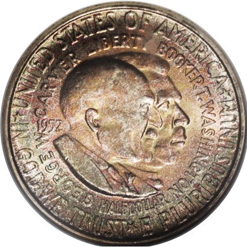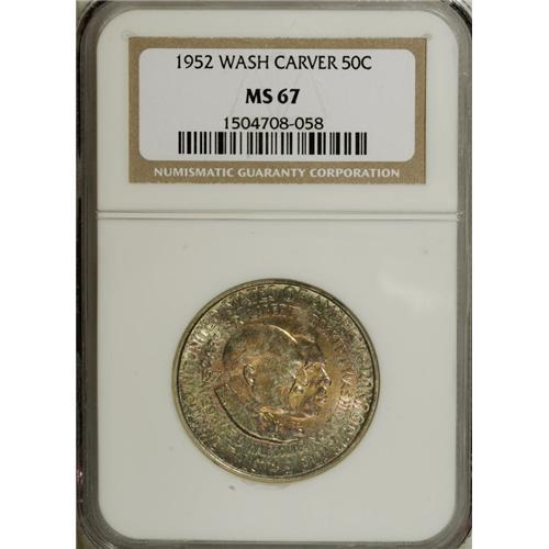 <B>1952 50C Washington-Carver MS67 NGC.</B></I> As eye-appealing an example of this issue as the present cataloger can recall seeing, with lush, dappled hues of gold, amber, lilac, heather, magenta, and jade-green, underneath which potent luster radiates. Both sides are essentially mark-free, and the allure is simply enormous. Census: 9 in 67, 0 finer (1/07).<BR><BR><b>Shipping:</b> Coins & Currency (<a target="_blank" href="http://www.heritageauctions.com/common/shipping.php">view shipping information</a>)