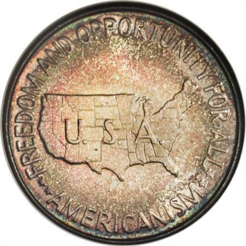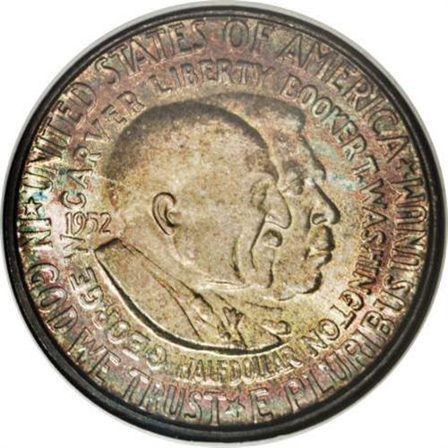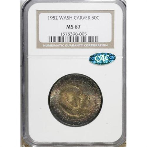<B>1952 50C Washington-Carver MS67 NGC. CAC.</B></I> Both sides are dramatically toned lemon-gold, cherry-red, and sea-green. Lustrous and unabraded with an above average strike for this often indifferently produced type. This issue has a high mintage, but emerges as a significant conditional rarity at the MS67 level. Census: 13 in 67, 0 finer (3/08).<BR><BR><b>Shipping:</b> Coins & Currency (<a target="_blank" href="http://www.heritageauctions.com/common/shipping.php">view shipping information</a>)