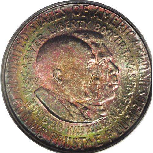 <B>1952 50C Washington-Carver MS67 PCGS.</B></I> Much like the extraordinary Bruce Scher specimen in our February, 2005 Long Beach Sale (which sold for an astounding $17,250), this Superb Washington-Carver half dollar combines dynamic luster and strong central with breathtakingly beautiful emerald-green, purple-rose, and yellow-golden iridescence. Yes, over 2 million pieces were originally struck, but, in addition to its scarcity at this grade level, the odds of aligning all the ingredients into an aesthetic masterpiece are long indeed. Population: 4 in 67, 0 finer (11/06).<BR><BR><b>Shipping:</b> Coin/Currency (<a target="_blank" href="http://www.heritageauctions.com/common/shipping.php">view shipping information</a>)
