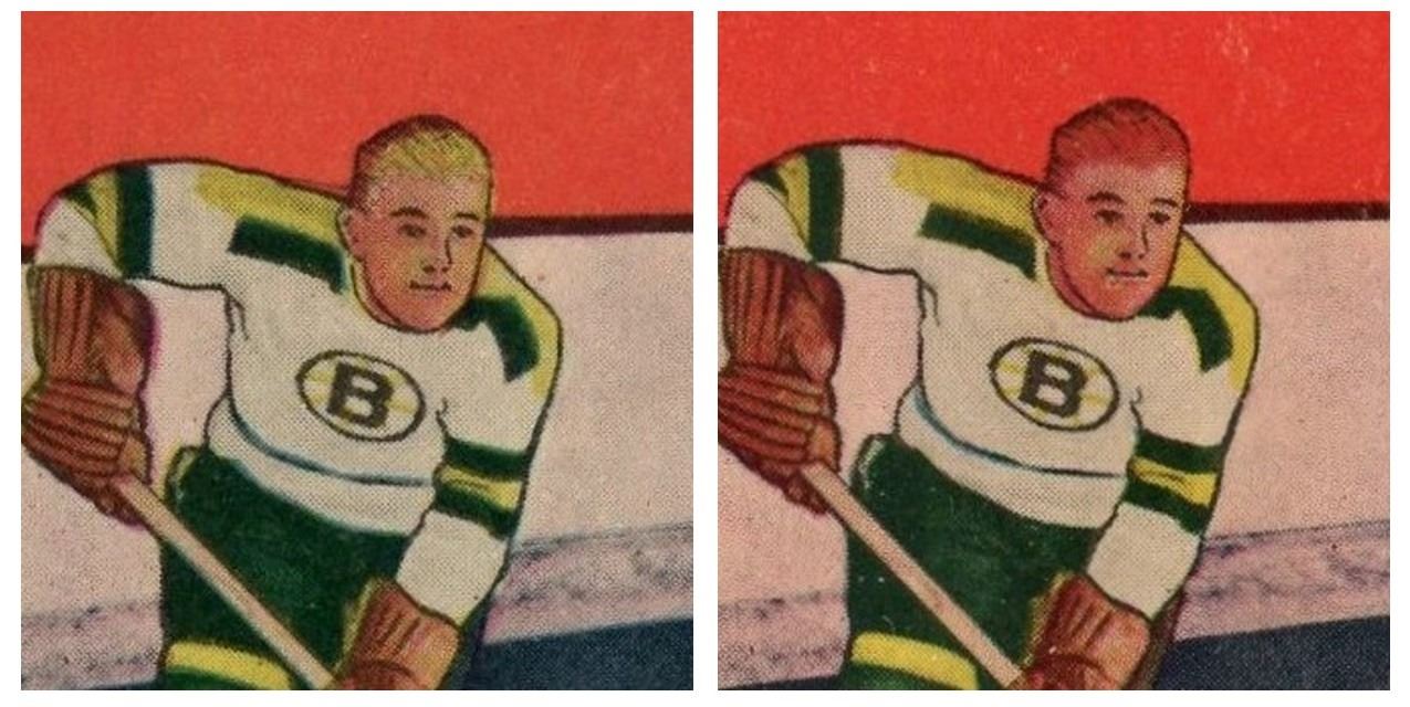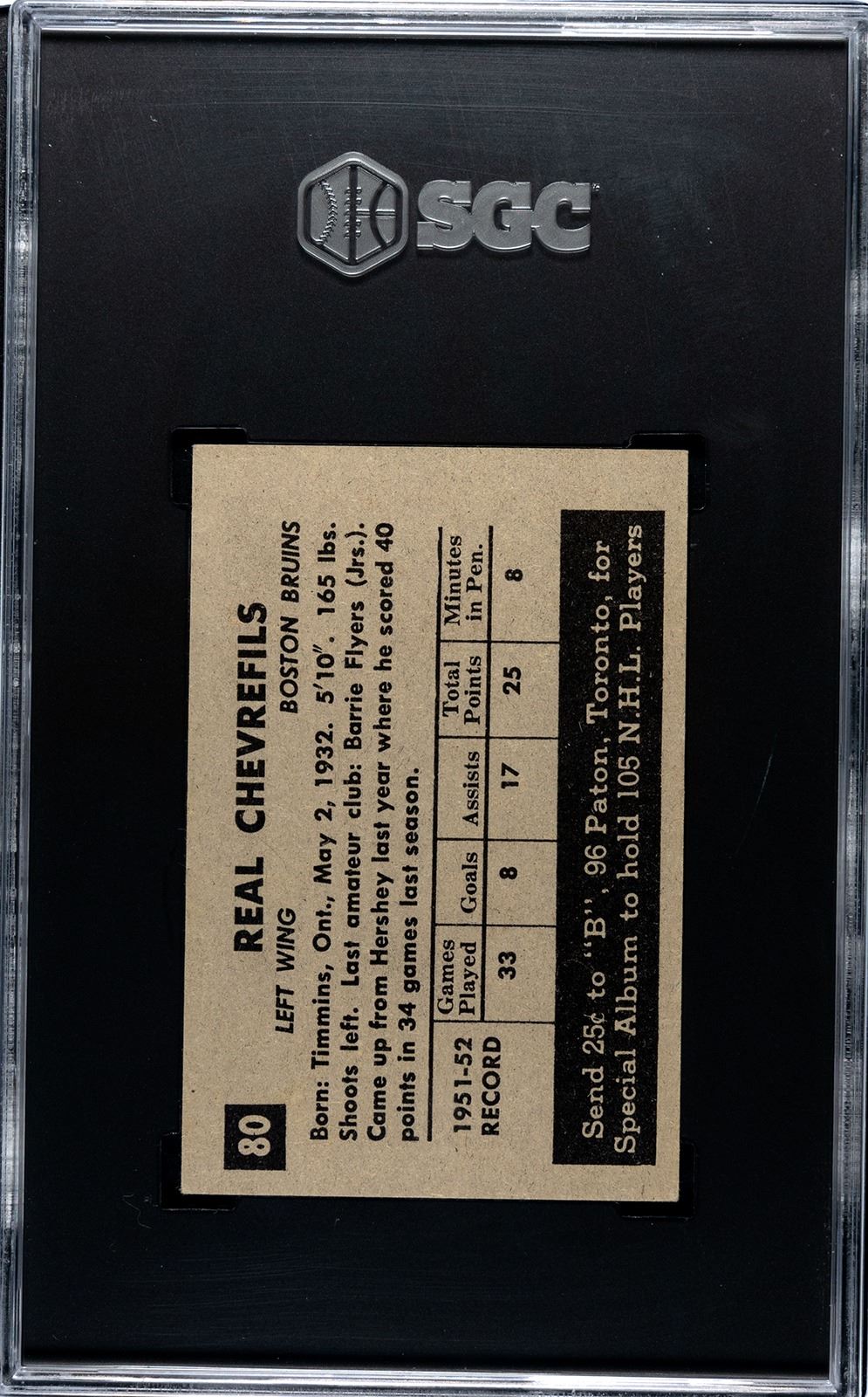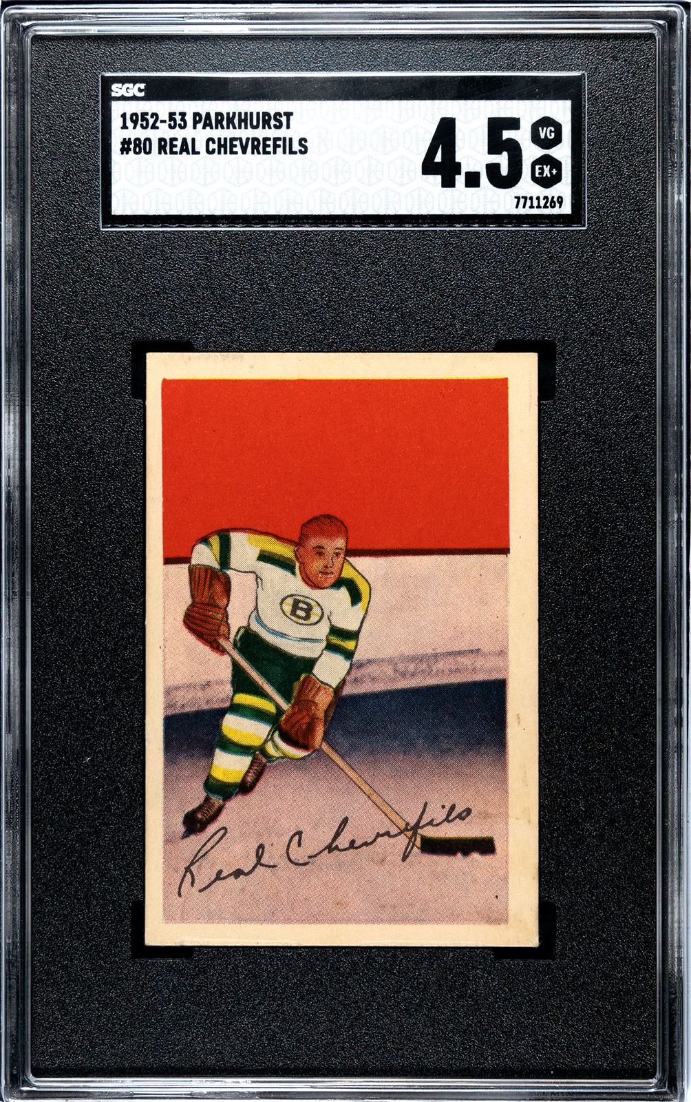 Chevrefils broke in with a ton of promise, but well publicized battles with alcohol abuse derailed his career. This is his rookie card, which apparently can be found with "red" or "blonde" hair. The red version appears to show more red ink as the skin tone reflects, whereas the blonde version shows a lighter skin tone. Although the blonde version shows darker hair towards the back of his head, the blonde area shows detail and precision along the hairline. This variation is not recognized by the main guides and graders, but if you've seen enough 1952 Parkie Chevrefils there certainly appears to be two different versions. Graded a clean 4.5 VG-EX+ by SGC.