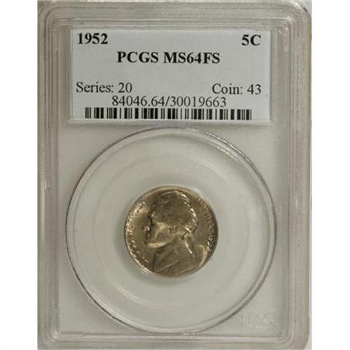<B>1952 5C MS64 Full Steps PCGS.</B></I> The shining surfaces of this near-Gem display vibrant gold and apricot patina. A crisply struck representative of this postwar Jefferson issue that shows excellent delineation on the steps. Population: 10 in 64 Full Steps, 12 finer (8/07).<BR><BR><b>Shipping:</b> Coins & Currency (<a target="_blank" href="http://www.heritageauctions.com/common/shipping.php">view shipping information</a>)