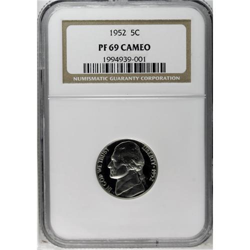 <B>1952<5C> PR69 Cameo NGC.</B></I> This piece has a razor-sharp strike with liquid mirrors and mint frost on the ivory devices. For those looking to build a high-caliber set of proof Jefferson nickels, this is the coin to buy. Census: 14 in 69, 0 finer (6/06).