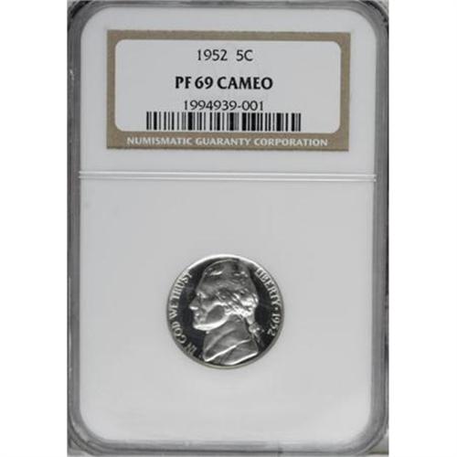 <B>1952 5C PR69 Cameo NGC.</B></I> This piece has a razor-sharp strike with liquid mirrors and mint frost on the ivory devices. For those looking to build a high-caliber set of proof Jefferson nickels, this is the coin to buy. Census: 15 in 69 Cameo, 0 finer (1/08).<BR><BR><b>Shipping:</b> Coins & Currency (<a target="_blank" href="http://www.heritageauctions.com/common/shipping.php">view shipping information</a>)