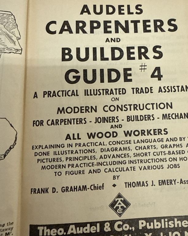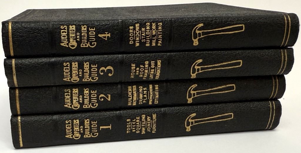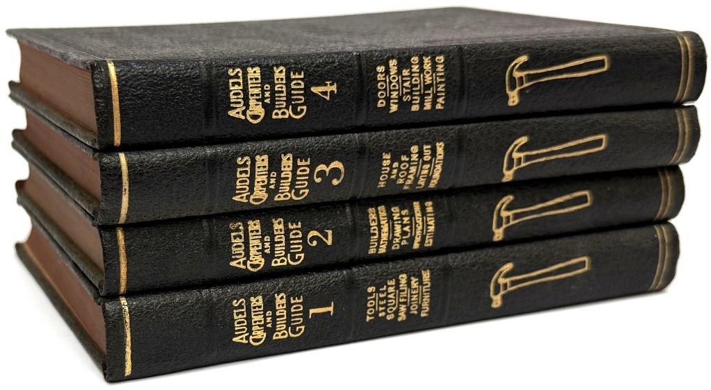 Item/Description: 1952 Audel's Carpenters and Builders Guide. Complete four-volume set numbered 1-4. Printed books with cloth bindings.
