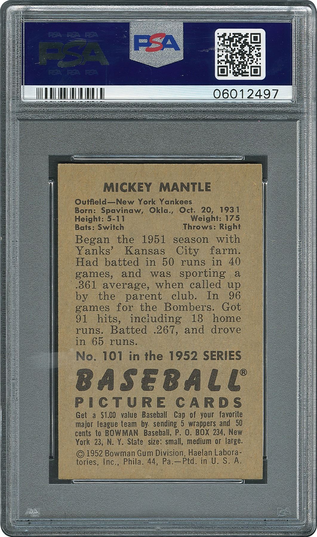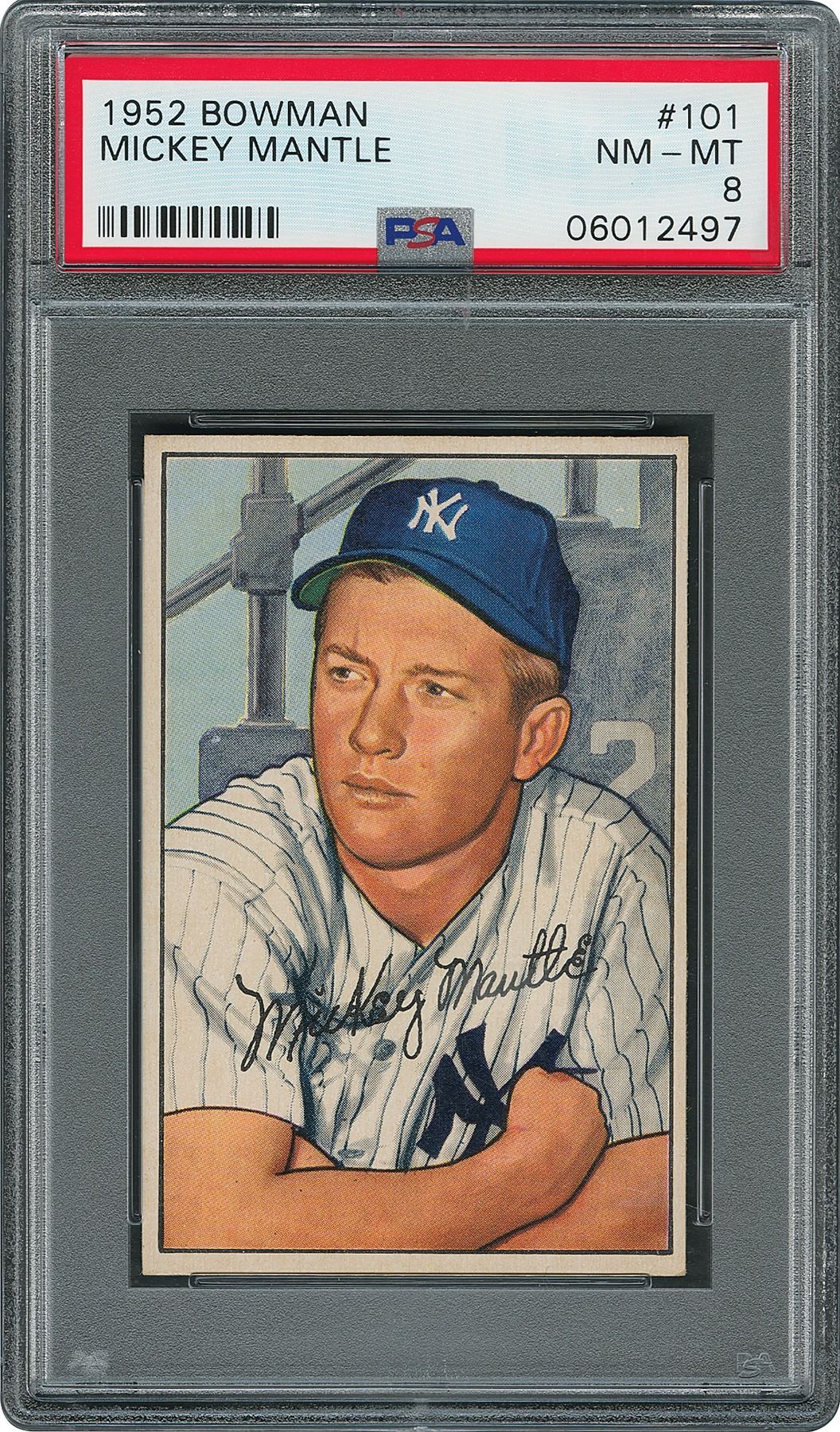 Graded by PSA NM-MT 8. Very sharp card, strong color, clear registration and clean surfaces front and back. Only 15 examples grade higher than this offered piece. The beauty of this card is enhanced by the smooth glossy surface and undisturbed edges. The strong reverse is perfectly centered and is without the usual gum staining. A gorgeous second year card for Mantle that captures him in a resplendent pose, youthful but poised for greatness. While 1951 was Mickey Mantle's rookie season, it was the 1952 baseball season which solidified Mantle's career as a bona fide superstar and tremendous clutch player. In the 1952 World Series, with the Yankees down 3 games to 2, the 20 year old Mantle homered late in both Games 6 and 7 to lead the Yankees to their fourth straight World Series crown. Strong NM-MT condition.