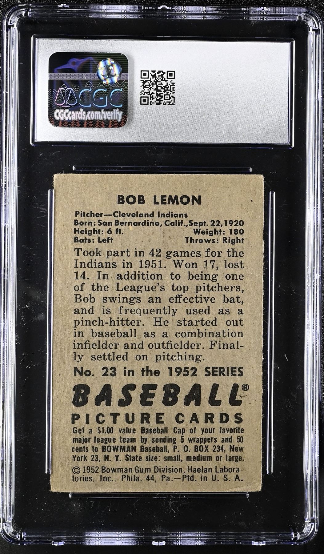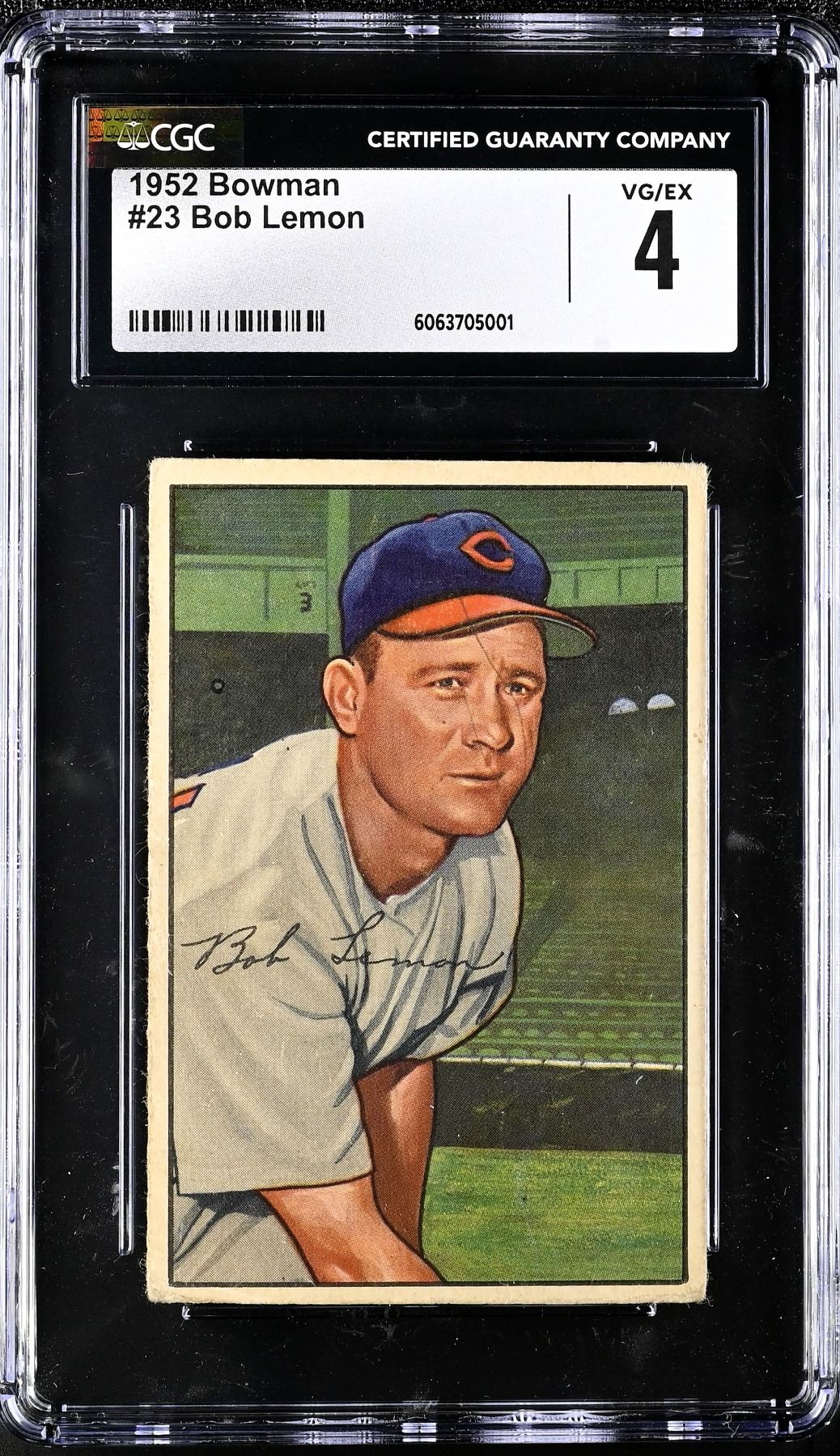 HOF pitcher Bob Lemon was a workhorse starter who played 13 seasons for the Cleveland Indians. He would win 20 games seven times, go 207-128 lifetime, lead the AL in wins three times, in complete games five times (including 28 in 1952), innings pitched four times, and strikeouts once. He would win both his starts in the 1948 World Series, allowing only three earned runs over 16 innings, including a complete game win over future HOFer Warren Spahn, and the final game, which secured Cleveland first World Series title in 28 years, and the franchises last. Graded 4 VG-EX by CGC.