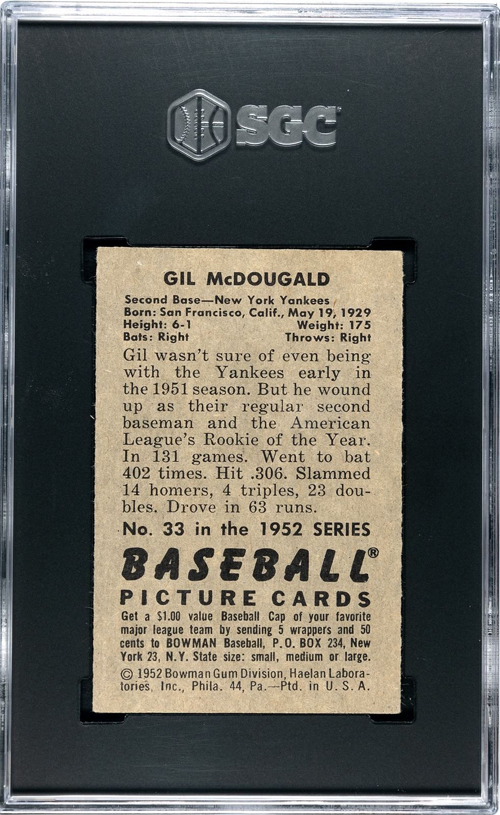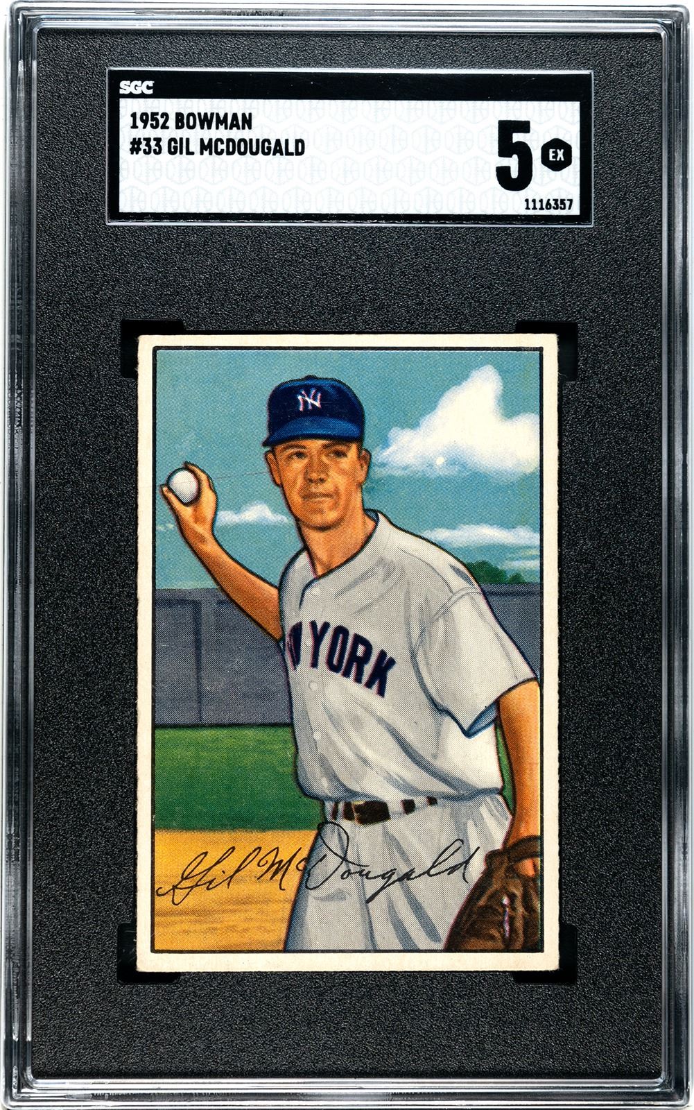 Plenty of eye appeal on this rookie card of the New York Yankees favorite. Rookie of the Year in 1951, he drove in 6 runs in one inning that year, and in the World Series became the first rookie to hit a grand slam. He won 8 AL Pennants and 5 World Series championships in his 10-year career. Graded a visually strong 5 EX by SGC!
