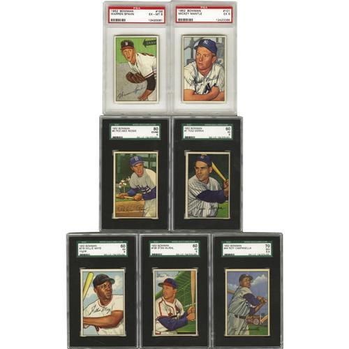 <B>1952 Bowman Baseball Complete Set (252).</B></I> This issue features the colorful artwork that the early 1950's Bowman issues were known for and it marks the last time that Bowman produced their popular 2 1/16" x 3 1/8" sized cards. A total of seven cards have been graded by PSA and SGC with an aggregate SMR value of $2464. Graded cards - <B>PSA EX-MT 6:</B></I> #156 Spahn; <B>PSA EX 5:</B></I> #101 Mantle; <B>SGC 80 EX-NM 6:</B></I> #8 Reese; <B>SGC 70 EX+ 5.5:</B></I> #44 Campanella; <B>SGC 60 EX 5:</B></I> #1 Berra, 196 Musial, 218 Mays. Ungraded cards include #4 Roberts (VG/EX), 11 Kiner (VG), 21 Fox (EX/MT), 30 Schoendienst (VG), 43 Feller (VG/EX), 52 Rizzuto (EX/MT), 53 Ashburn (EX), 75 Kell (EX), 80 Hodges (EX), 115 Doby (NM), 116 Snider (EX), 142 Wynn (VG/EX), 145 Mize (EX), 146 Durocher (VG/EX), 168 Roe (VG/EX), 217 Stengel (EX), 232 Slaughter (VG/EX), 252 Crosetti (EX). Grades 10% NM to NM/MT, 69% EX to EX/MT, 21% VG to VG/EX.<BR><BR><b>Shipping:</b> Large Set or Notebook (<a target="_blank" href="http://www.heritageauctions.com/common/shipping.php">view shipping information</a>)