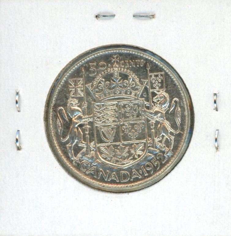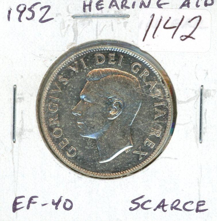 1952 Canadian Silver 50 Cents with Hearing Aid in the King’s Ear. The result of a Die Clash. Scarce. EF-40. Nice.