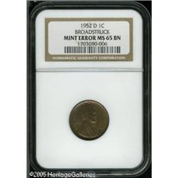 <B>1952-D 1C Lincoln Cent--Broadstruck--MS65 Brown NGC.</B></I> A lustrous golden-brown Gem that has iridescent sky-blue peripheral color. The legends are distorted as they approach the rim, which is the classic appearance of a broadstruck piece. Lot:10855
